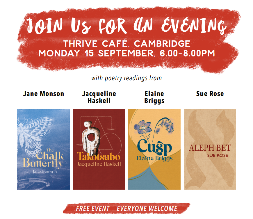 Join Sue Rose launching Aleph bet and Jacqueline Haskell launching Takotsubo with Elaine Briggs reading from Cusp, and Jane Monson reading from The Chalk Butterfly.